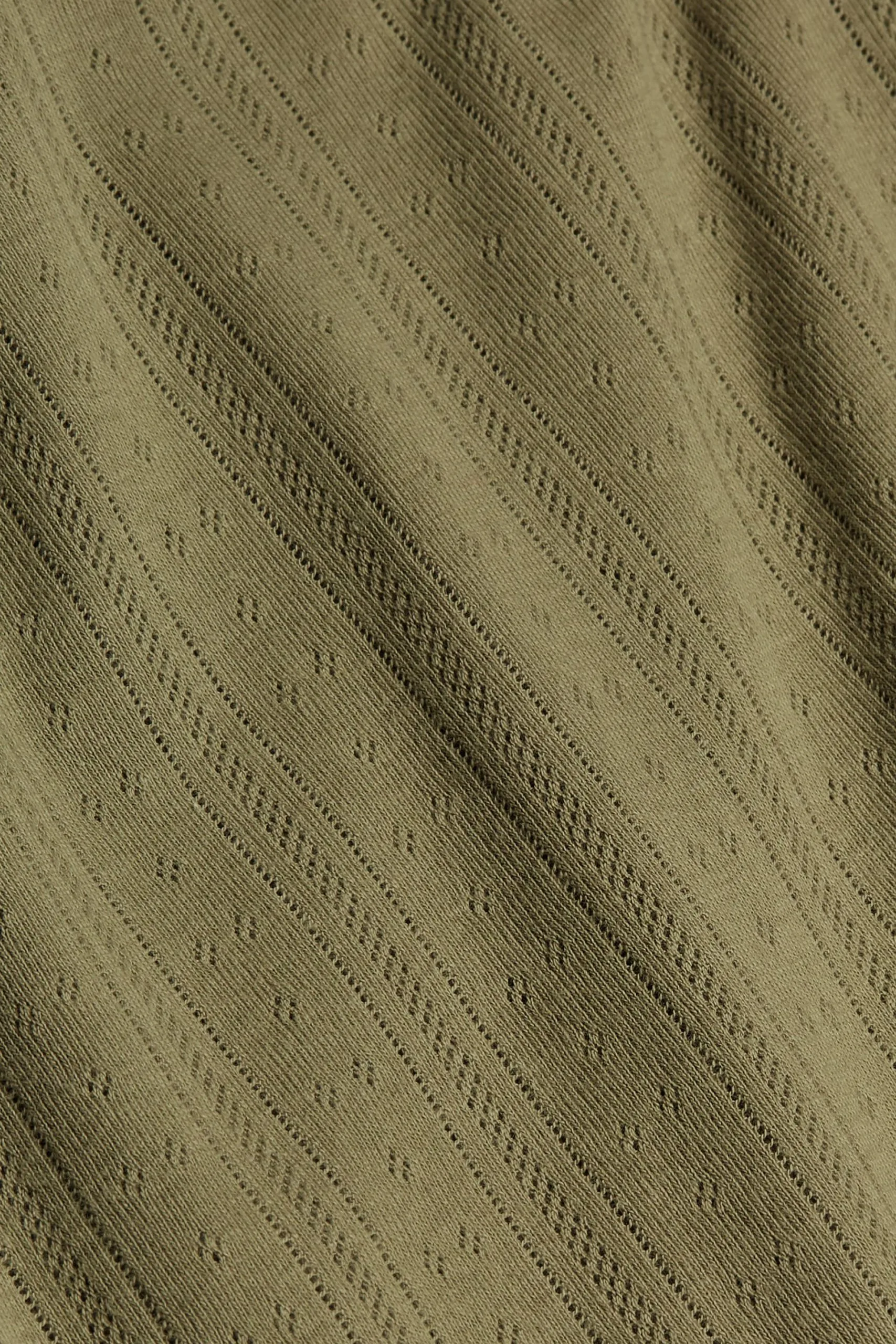 * Weicher Jersey aus reiner Bio-Baumwolle * Organic Cotton: Baumwolle aus kontrolliert biologischem Anbau * Halsferner Rundhals-Ausschnitt * Leicht durchscheinendes Ajour-Muster Pflegehinweise: 40°C Buntwäsche, Nicht bleichen, Nicht im Wäschetrockner trocknen, Mäßig heiß bügeln, Nicht trockenreinigen