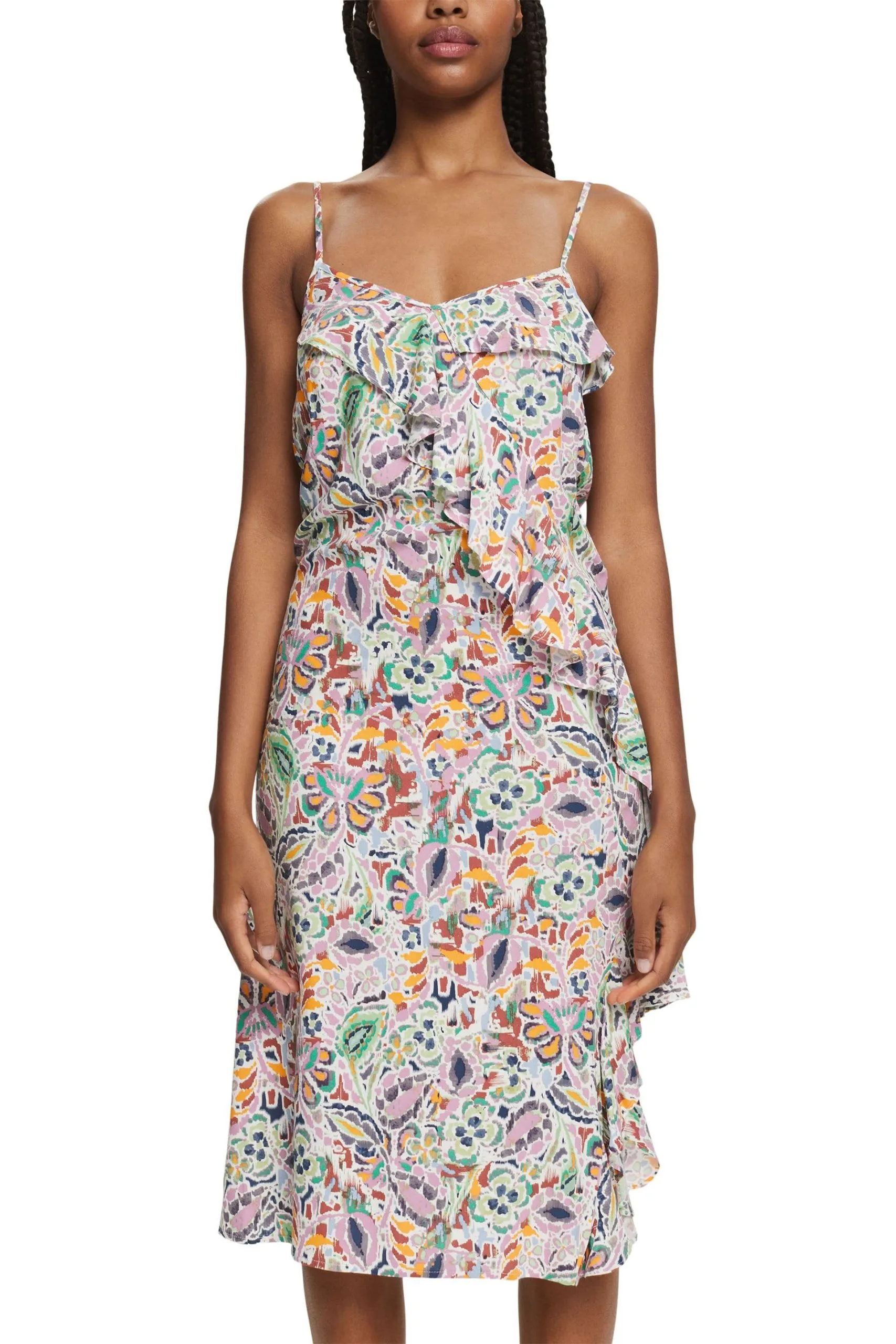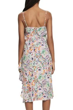 * Leichter Webstoff aus LENZING™ECOVERO™ * LENZING™ ECOVERO™: Viskose-Fasern, die aus nachhaltigem Holz und Zellstoff gewonnen werden und aus zertifizierten und kontrollierten Quellen stammen * V-Ausschnitt * Reißverschluss am Rücken * Längenverstellbare Spaghettiträger * Allover bunt gemustert * Asymmetrisch angesetzte Volants * Midilänge Pflegehinweise: 30°C Pflegeleicht, Nicht bleichen, Nicht im Wäschetrockner trocknen, Mäßig heiß bügeln, Nicht trockenreinigen