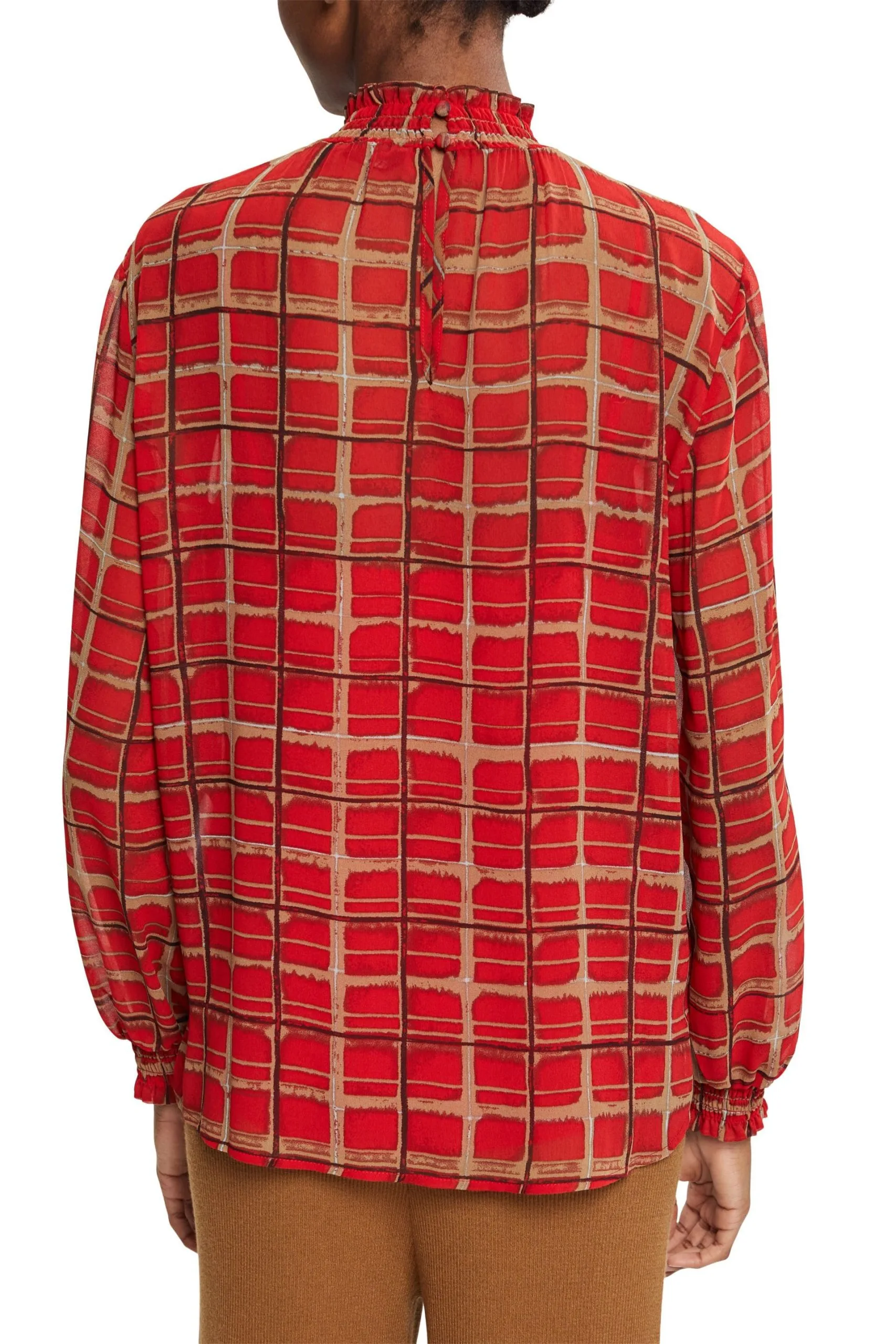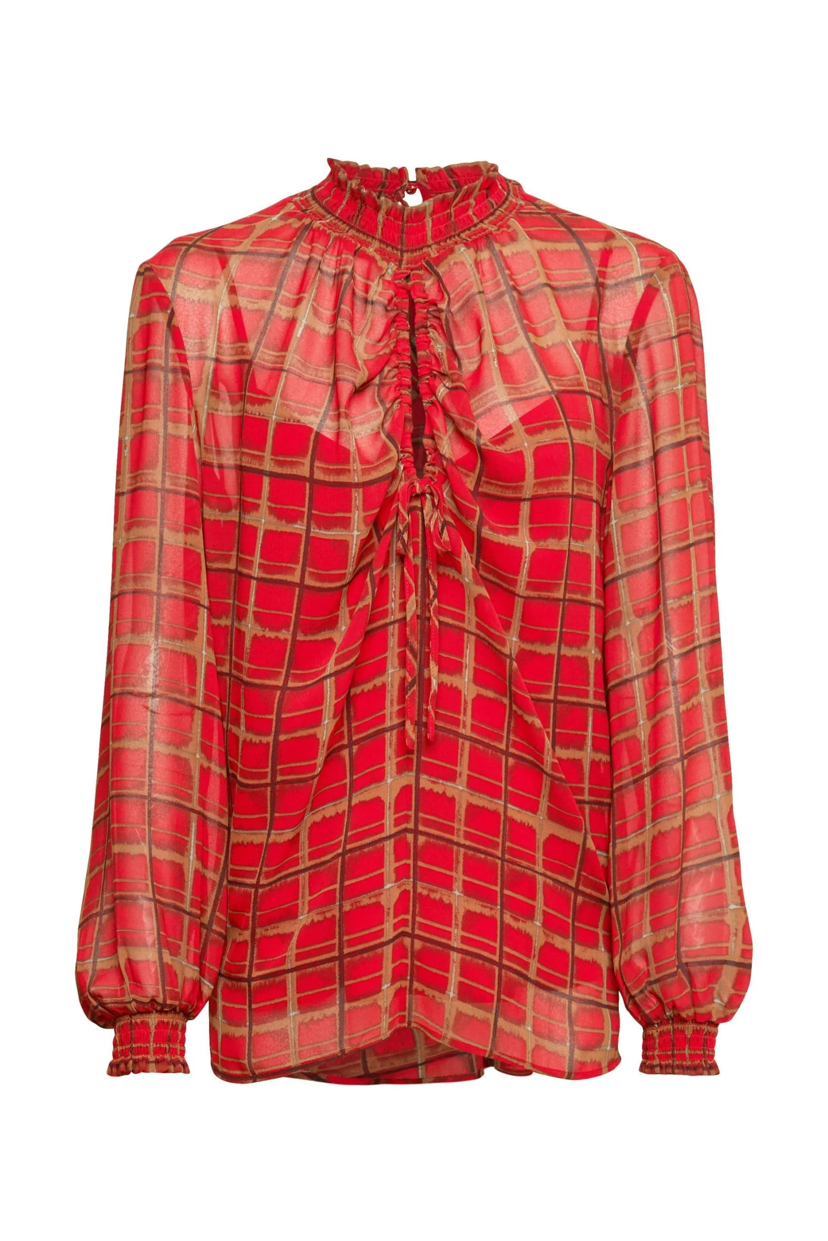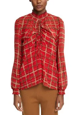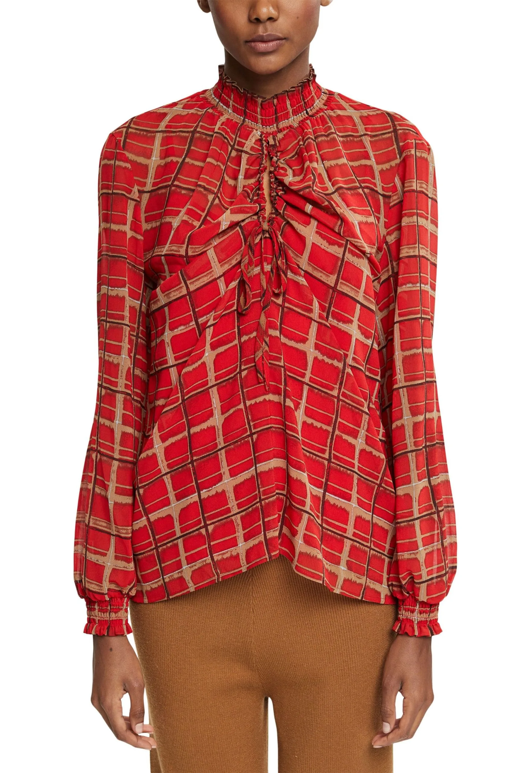 * Leichter Chiffon mit Muster * Blickdichtes Untertop mit verstellbaren Spaghettiträgern aus recyceltem Material * Gesmokter Stehkragen mit Knöpfen hinten * Gesmokter Ärmelabschluss * Cut-Out mit Durchzugband auf der Vorderseite * Lockere Passform Pflegehinweise: 30°C Pflegeleicht, Nicht bleichen, Nicht im Wäschetrockner trocknen, Nicht heiß bügeln, Behandlung in Reinigungsmaschine mit folgenden Lösemitteln: Perchlorethylen, Kohlenwasserstoffe