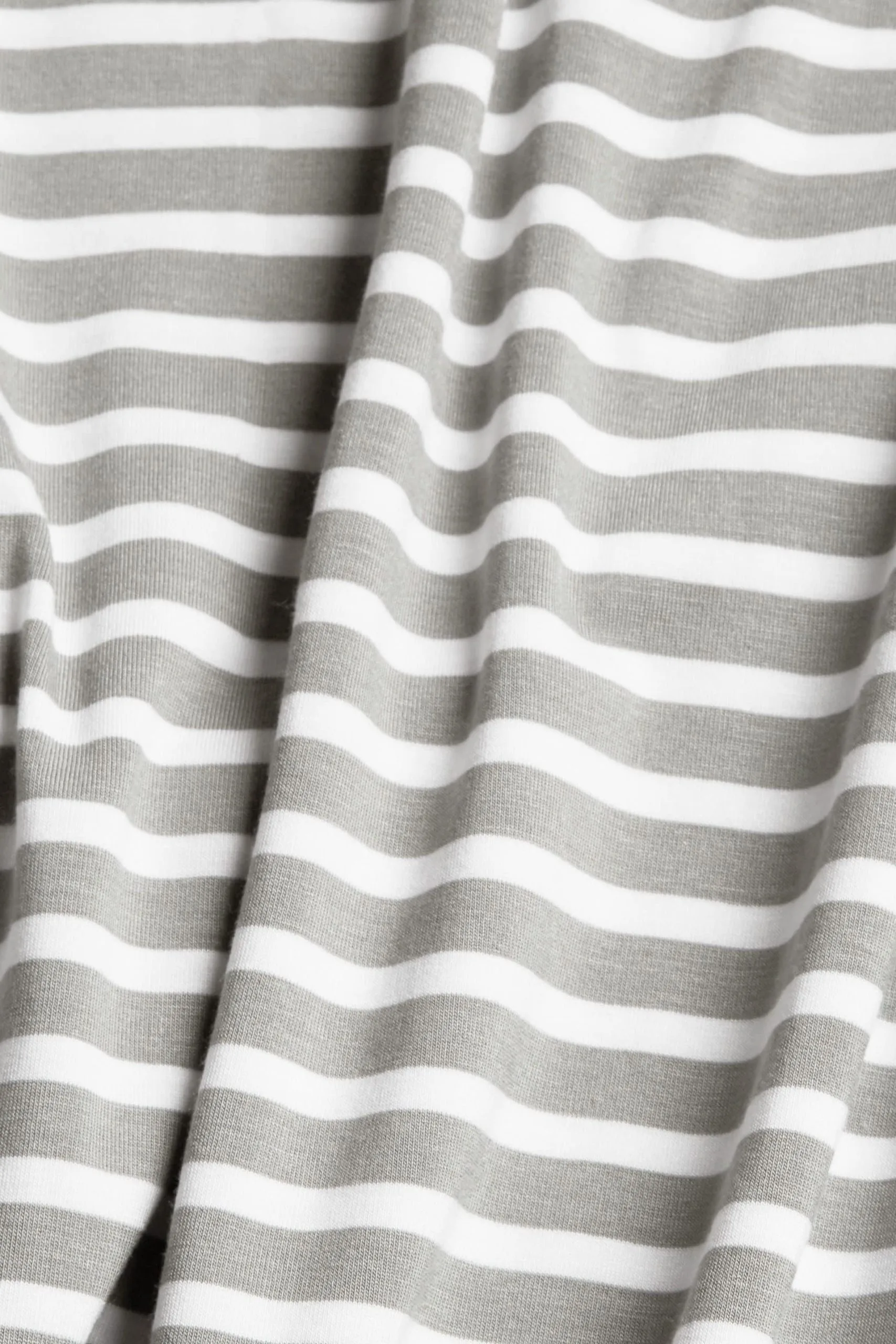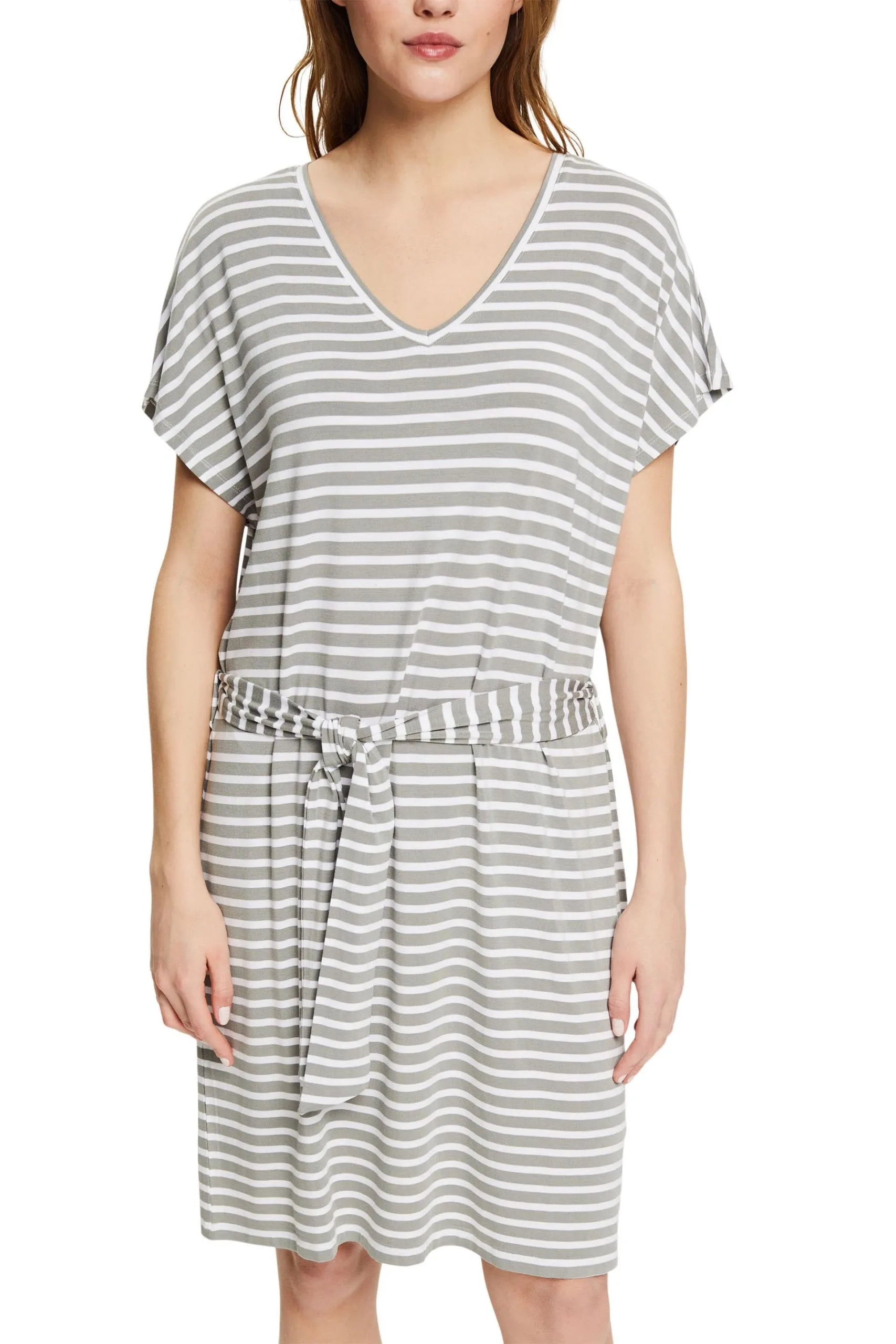 * Weicher JerseyLENZING™ ECOVERO™ mit Stretchkomfort * LENZING™ ECOVERO™: Viskose-Fasern, die aus nachhaltigem Holz und Zellstoff gewonnen werden und aus zertifizierten und kontrollierten Quellen stammen * Allover Streifenmuster * V-Ausschnitt * Abnehmbarer, stoffeigener Bindegürtel * Lockere Passform Pflegehinweise: 30°C Pflegeleicht, Nicht bleichen, Nicht im Wäschetrockner trocknen, Nicht heiß bügeln, Nicht trockenreinigen