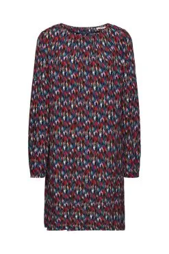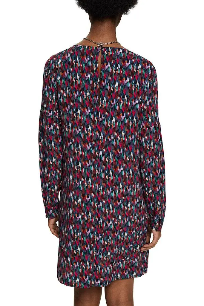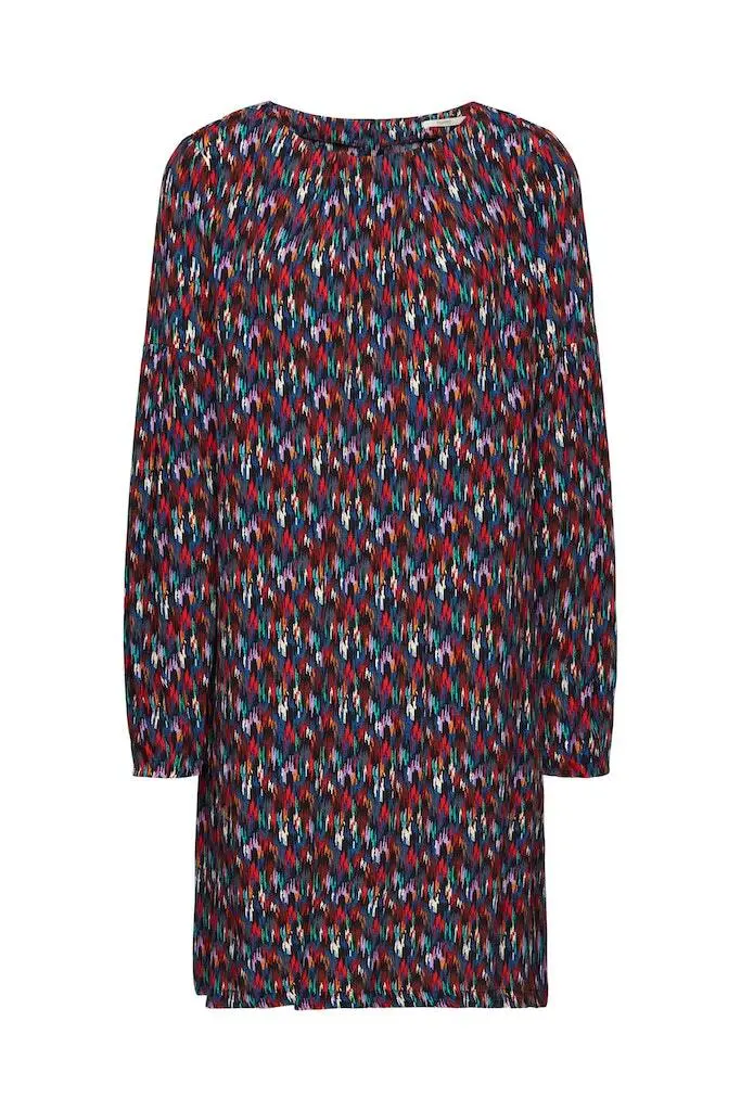 Fliessender Web-Stoff aus reiner Viskose Rundhalsausschnitt vorn Key-Hole mit Knopf hinten Allover Muster Geknoepfte Manschetten Lockerer Schnitt Mini-Laenge