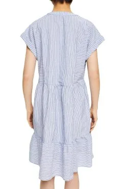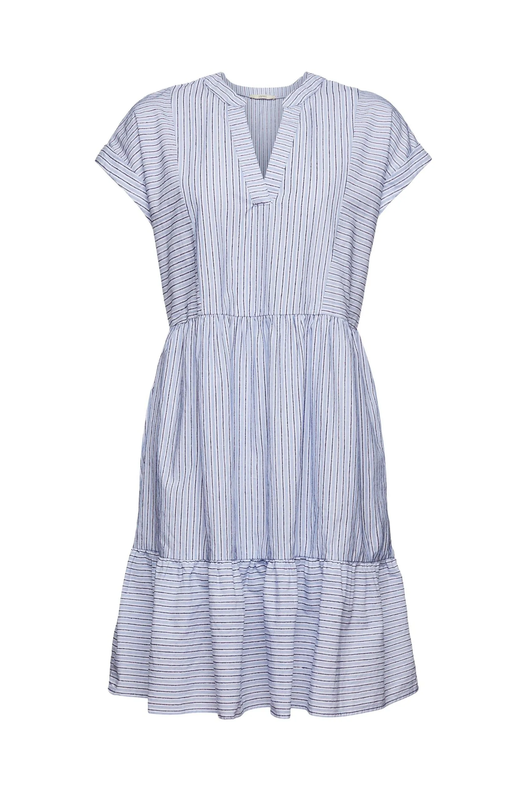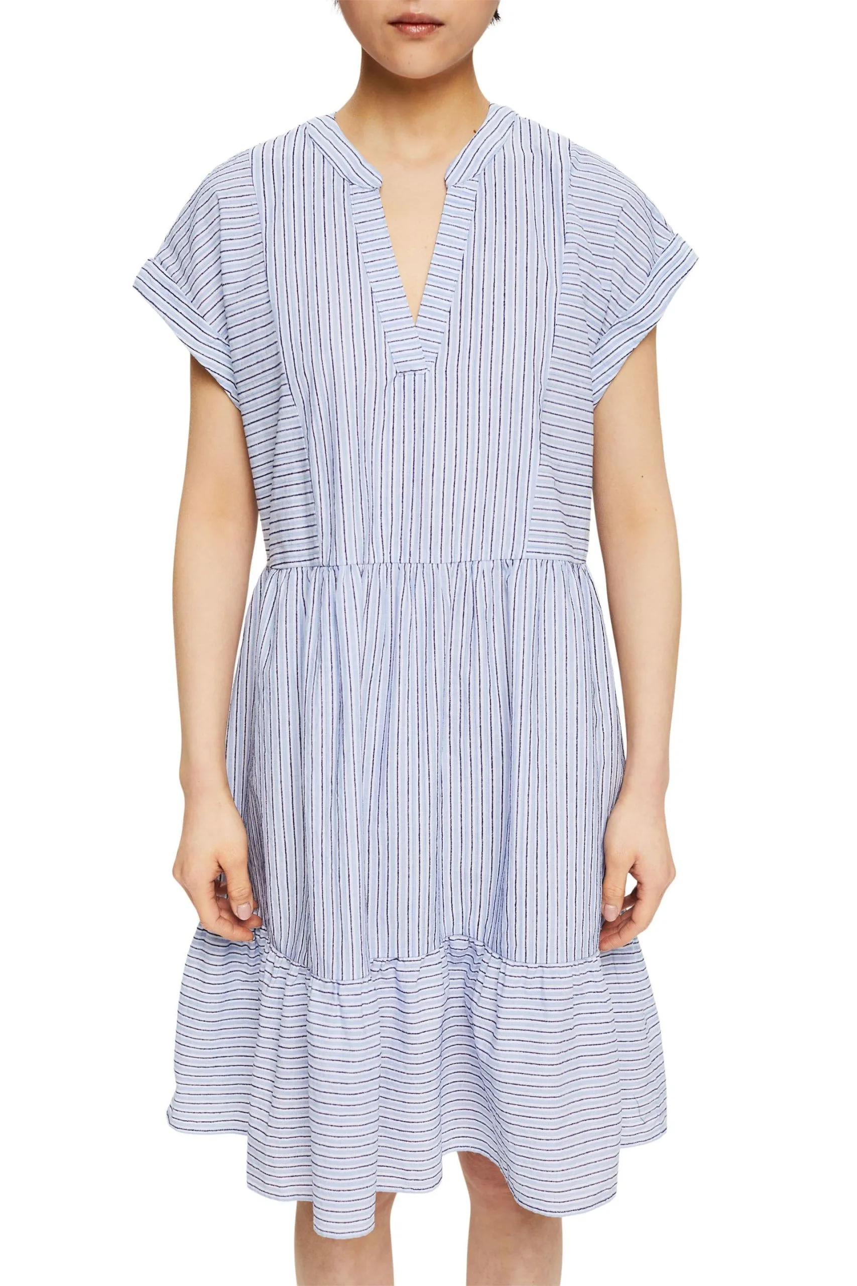 * Webstoff mit Strukturstreifen aus Baumwolle * Mix aus Quer- und Längsstreifen * Kelchausschnitt * Fixierte Umschlagsäume an den Ärmeln * Breiter Volantsaum * Weite Passform Pflegehinweise: 40°C Buntwäsche, Nicht bleichen, Schonende Trocknung, Mäßig heiß bügeln, Nicht trockenreinigen