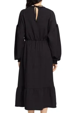 * Webstoff aus recycelten Fasern mit LENZING™ ECOVERO™ Viskose * LENZING™ ECOVERO™: Viskosefasern, die aus nachhaltigem Holz und Zellstoff aus zertifizierten und kontrollierten Quellen gewonnen werden. * LENZING™ ECOVERO™ sind Markenzeichen der Lenzing AG * Runder Ausschnitt mit Schleifendetail hinten * Elastische Taille * Ärmelenden mit Gummibund * Abgestufte Volants * Midi-Länge Pflegehinweise: 30°C Pflegeleicht, Nicht bleichen, Nicht im Wäschetrockner trocknen, Mäßig heiß bügeln, Nicht trockenreinigen