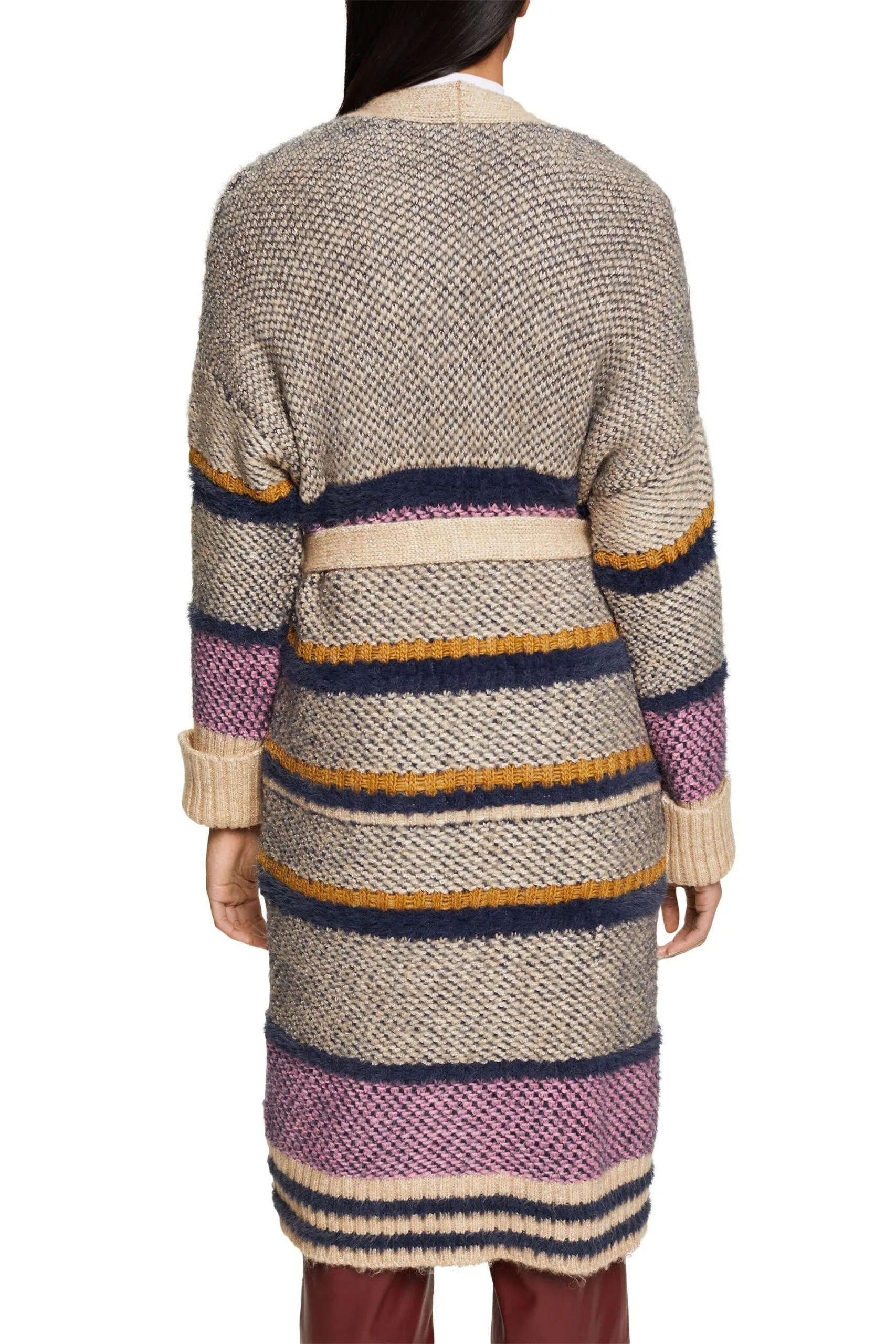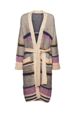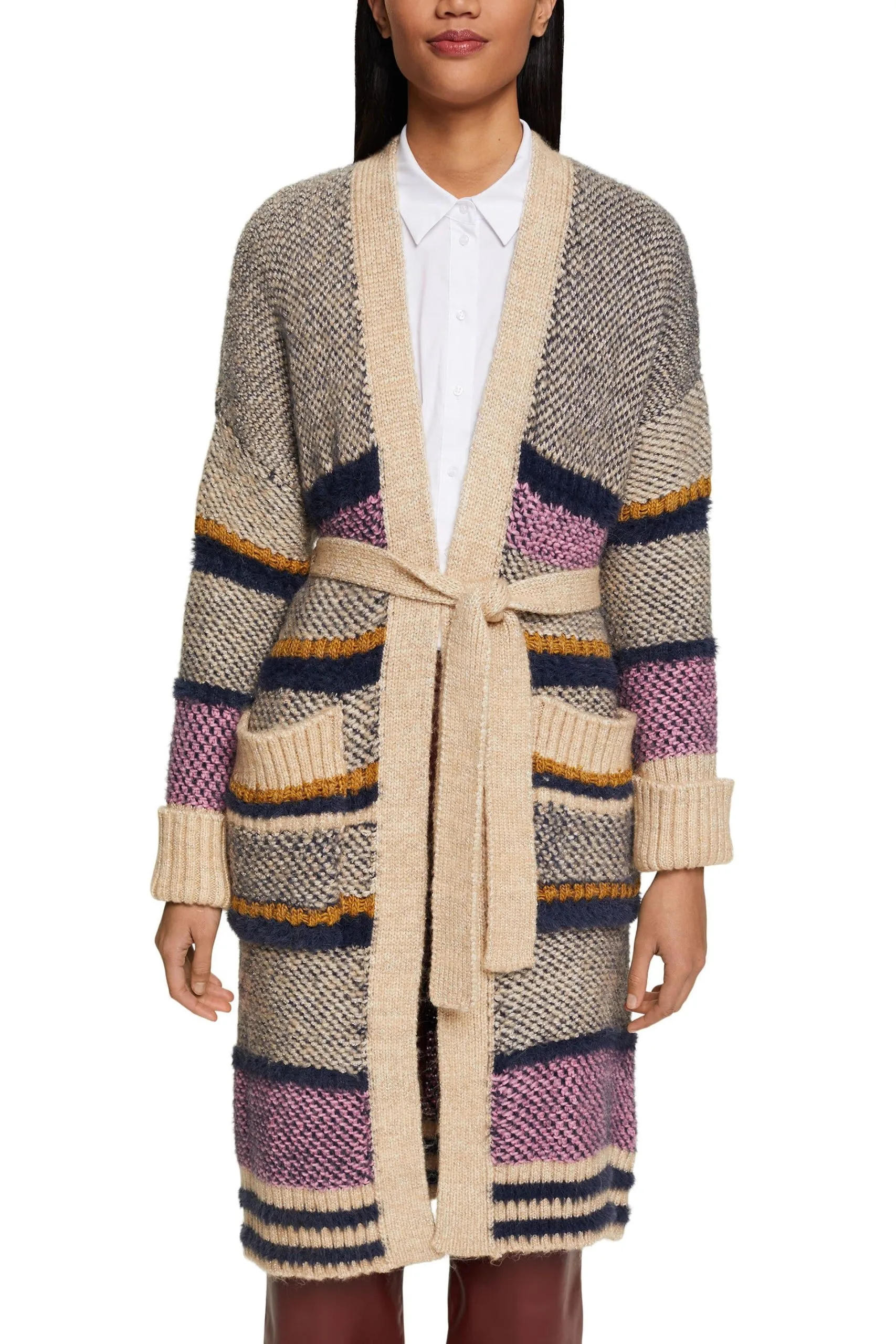 * Weicher Materialmix in Grobstrick * Überschnittene Schultern * Trendiger Metallic-Schimmer * Zwei aufgesetzte Taschen in gerippter Optik * Fixierte Aufschläge an den Ärmelenden * Lockerer Oversize-Schnitt * Gürtelschlaufen mit Bindegürtel Pflegehinweise: 30°C Pflegeleicht, Nicht bleichen, Nicht im Wäschetrockner trocknen, Nicht heiß bügeln, Nicht trockenreinigen