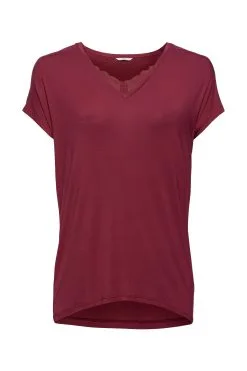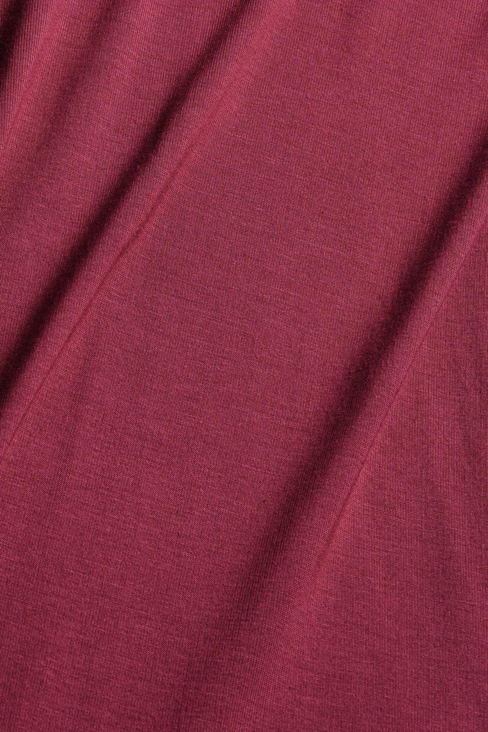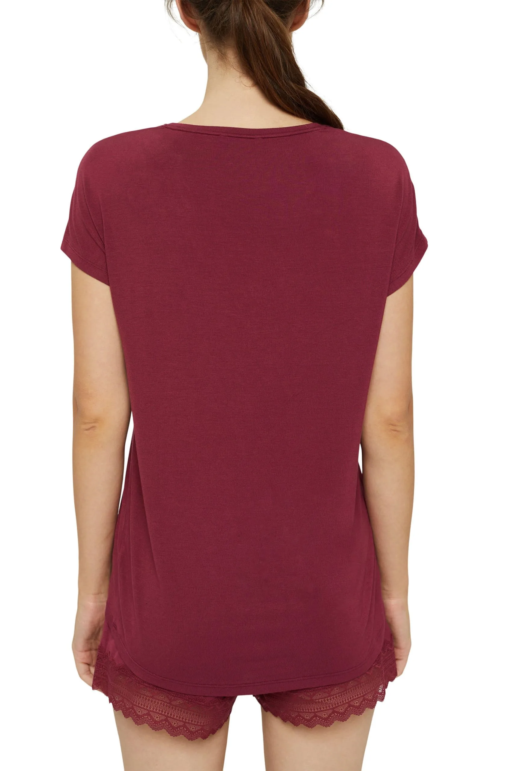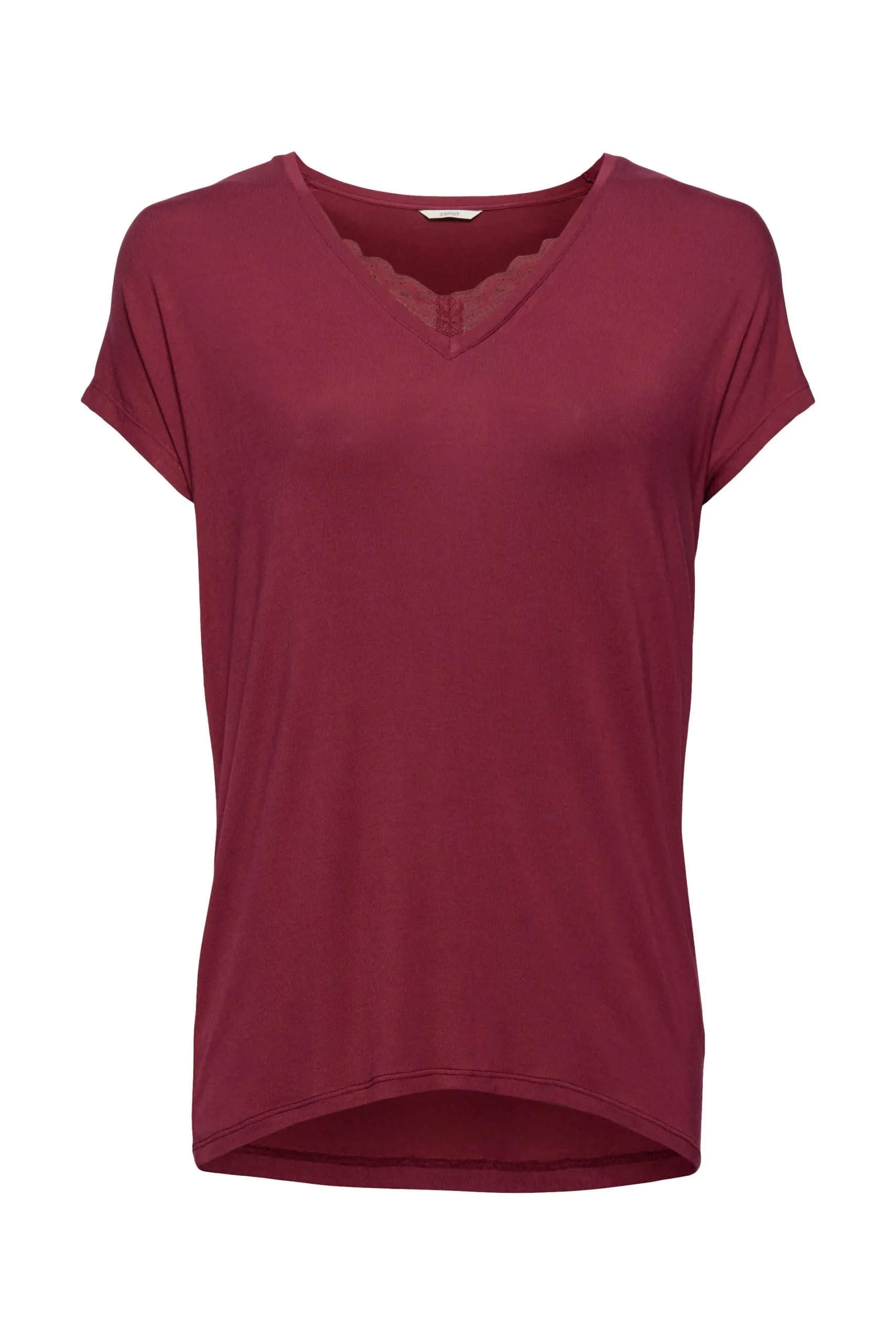 * Weicher, fließender JerseyLENZING™ ECOVERO™ * LENZING™ ECOVERO™: Viskose-Fasern, die aus nachhaltigem Holz und Zellstoff gewonnen werden und aus zertifizierten und kontrollierten Quellen stammen * V-Ausschnitt mit zartem Spitzenbesatz * Überschnittene Schultern * Lockere, gerade Passform mit abgerundetem Saum Pflegehinweise: 40°C Buntwäsche, Nicht bleichen, Nicht im Wäschetrockner trocknen, Mäßig heiß bügeln, Nicht trockenreinigen