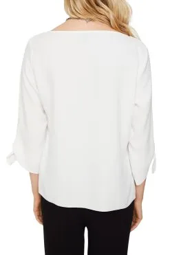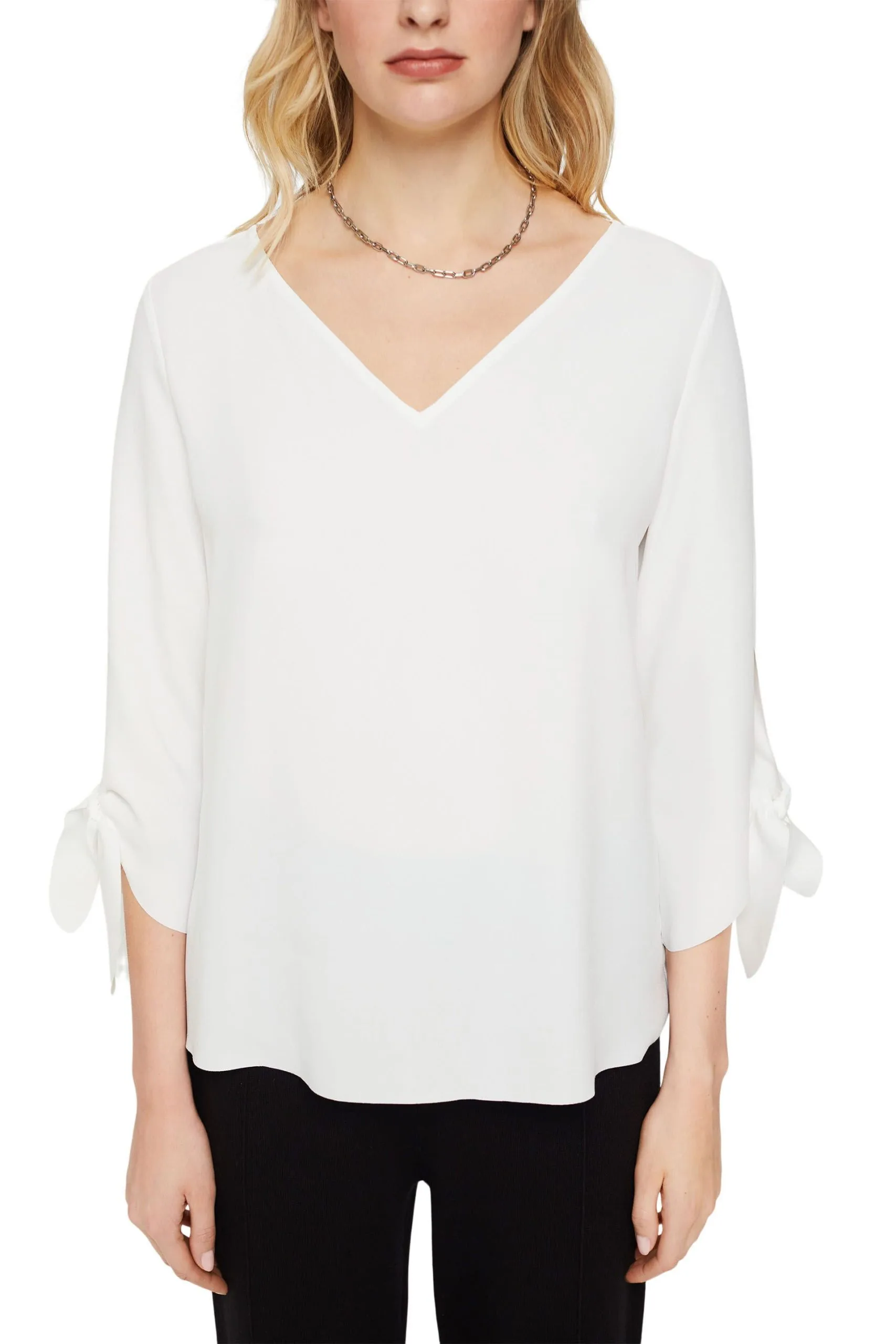 * Crêpe-Bluse mit Stretchkomfort * Großer, eingefasster V-Ausschnitt * Dreiviertelärmel mit geschnittenen Kanten und Schleifen-Details * Gerundeter, offenkantiger Saum Pflegehinweise: 40°C Pflegeleicht, Nicht bleichen, Nicht im Wäschetrockner trocknen, Mäßig heiß bügeln, Nicht trockenreinigen